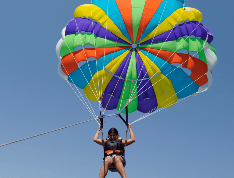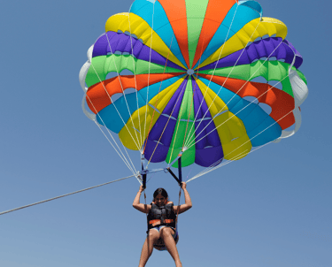 Soar high and enjoy breathtaking views of the coastline while parasailing in Goa.